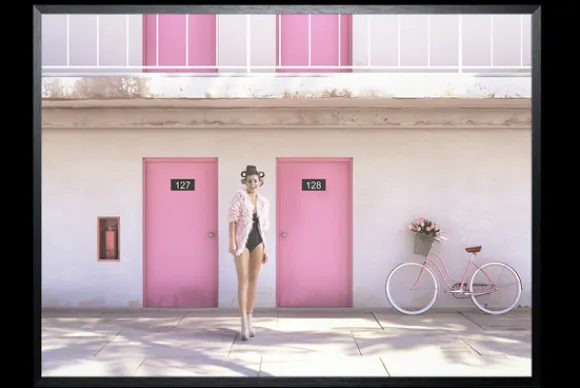 Art Print Pink Dream SHI770 van het merk Luxe Framing Art is verkrijgbaar in verschillende afmetingen. Op deze kleurrijke print zie je een vrouw staan voor een appartementencomplex met roze details. Deze Art Print wordt standaard met een zwarte lijst geleverd.