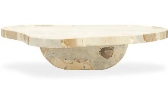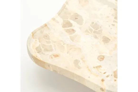 Het dienblad is gemaakt van marmer in zachte beige tinten met subtiele aders die elk exemplaar uniek maken. De gladde afwerking zorgt voor een luxe uitstraling, terwijl de speelse vorm een eigentijds karakter toevoegt.