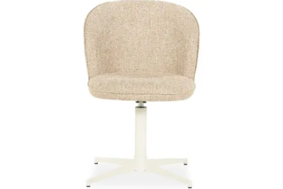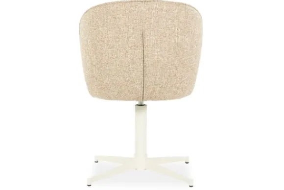 Het witte, poedergecoate metalen onderstel met draaifunctie zorgt voor een lichte, luchtige look en praktische wendbaarheid. De vierpoots kruisvoet geeft een subtiel industrieel randje en staat stevig en stabiel op iedere ondergrond.