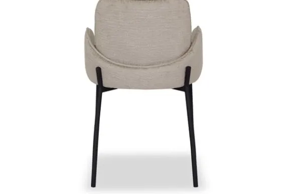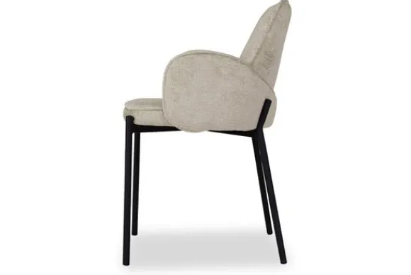 Eetkamerstoel Joni, uitgevoerd in beige elegance heeft een luxe ronde zitting, rugleuning en is in het bezit van armleuningen. Deze combinatie maakt Joni een luxe eetkamerstoel met ontzettend veel comfort. De armleuningen lopen achter de rugleuning langs waardoor de eetkamerstoel een uniek uiterlijk krijgt en er ook nog eens ontzettend leuk uitziet aan de achterkant. Dat is natuurlijk een fijne bijkomstigheid als de eetkamerstoelen aangeschoven staan aan tafel. Het ranke maar doorlopende zwarte frame waar de zitting als ware op rust geeft de eetkamerstoel een luchtige uitstraling. Het uiteinde van het frame loopt op vier zijdes een klein stukje door wat zorgt voor een speels effect.