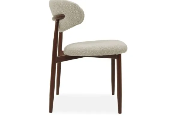 De stoel is uitgevoerd in de stof Lodge Shiitake 124 en staat op metalen poten met een walnut houtlook. Deze combinatie geeft de stoel een warme uitstraling en maakt hem tot een stijlvolle en praktische aanvulling aan de eettafel.