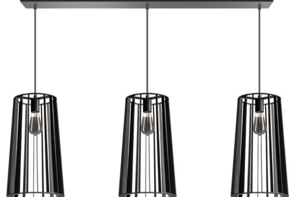 Hanglamp Blackbird 05-HL4187-30 van ETH is een stijlvolle eetkamerlamp van zwart metaal. De lamp heeft drie metalen lampenkappen met een diameter van 26cm, verdeeld over een breedte van 120cm. De eetkamerlamp wordt exclusief lichtbron geleverd. Doordat de lichtbron niet meegeleverd is, kun je zelf bepalen hoeveel licht je wilt en in welke kleur. De lamp heeft een E27-fitting en kan maximaal 60 watt aan.