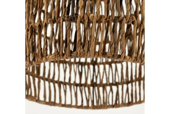 De handgeweven structuur vormt een open, luchtige kap die een subtiel spel van licht en schaduw creëert. De warme, bruine kleur van het vlechtwerk voegt een aards en stijlvol accent toe, terwijl de organische vorm zorgt voor een zachte en uitnodigende uitstraling.