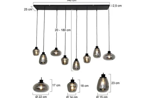 Hanglamp Reflexion 2680ZW van het merk Steinhauer is een 8-lichts hanglamp. Alle bollen zijn voorzien van een E27 (grote) fitting en geschikt voor alle soorten lichtbronnen tot 40 Watt. De bollen hebben verschillende vormen, hoogtes en diameters. Elke lichtbol is afzonderlijk in hoogte te verstellen, tijdens montage tot maximaal 160 centimeter. Hierdoor kun je een speels effect creëeren. De plafondplaat heeft een lengte van 145 centimeter. De lamp is dimbaar middels een externe dimmer en de bijbehorende lichtbron. Wordt exclusief lichtbron geleverd.