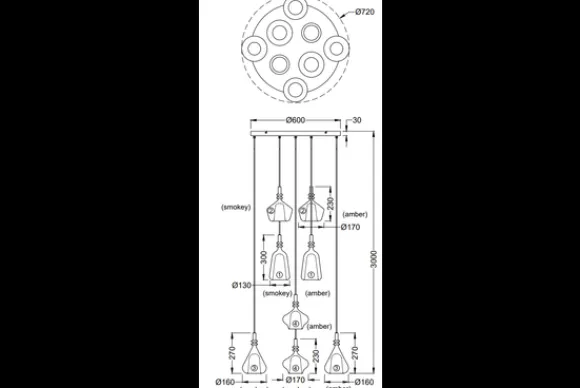 De plafondplaat is gemaakt van metaal en vormt een stevige basis voor de lamp. De verchroomde en amberkleurige glazen kappen geven de hanglamp een tijdloze uitstraling en zorgen voor een prettige lichtverdeling in de ruimte.