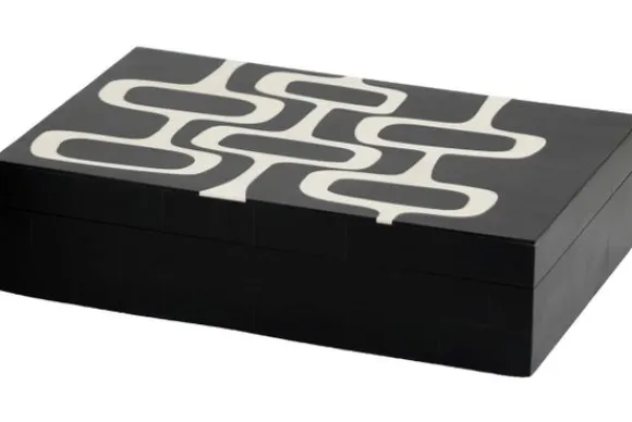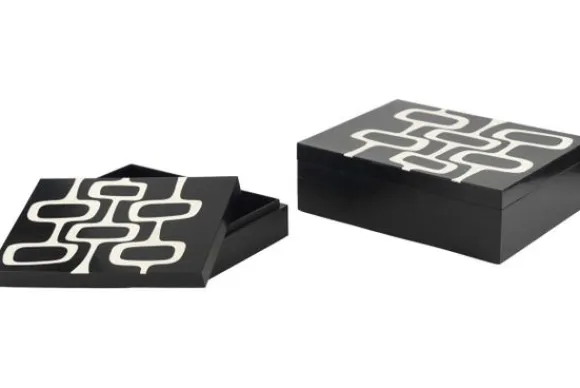 Opbergboxen Lux 215803 van het merk Richmond Interiors is een set van twee opbergboxen met een strak grafisch patroon op de deksel. De boxen zijn geschikt voor het opbergen van kleine accessoires zoals sieraden, afstandsbedieningen of andere items.