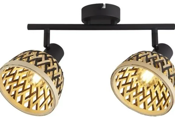 Plafondlamp 19931-2BK Lance van het merk Searchlight is gemaakt van zwart metaal en gevlochten bamboe. Deze lamp heeft twee lichtbronnen. Er zijn verschillende versies verkrijgbaar in deze lampenserie.
