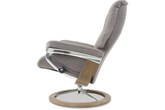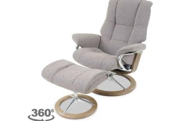 Relaxfauteuil Mayfair Signature van het merk Stressless is verkrijgbaar in alle kleuren. Tevens is de fauteuil leverbaar in stof en rundleder. Je kunt bij deze fauteuil kiezen uit diverse maten zoals Small, Medium en Large. Deze fauteuil heeft een Plus en Glide Systeem: Aan beide zijden van de fauteuil zit een knop waarmee je de weerstand van de stoel kan aanpassen naar eigen behoefte. Door de knoppen in tegengestelde richting te draaien stel je jouw ideale relaxpositie samen. Op die manier krijgt de nek en de onderrug goede onderstuening. Door de rugleuning naar voren te buigen activeer je de slaapfunctie. Op het moment dan je weer rechtop komt stelt de stoel zichzelf weer bij naar de normale stand.