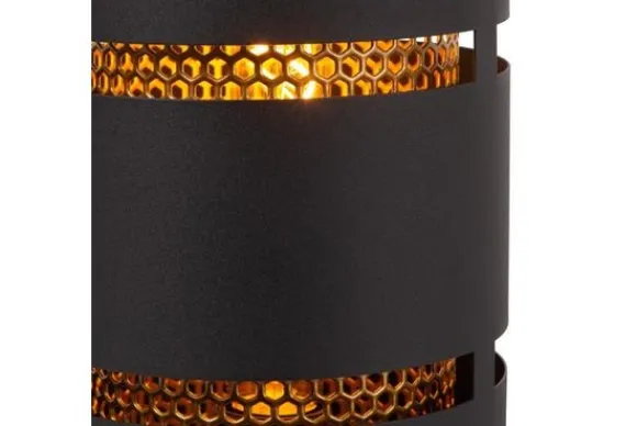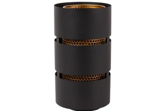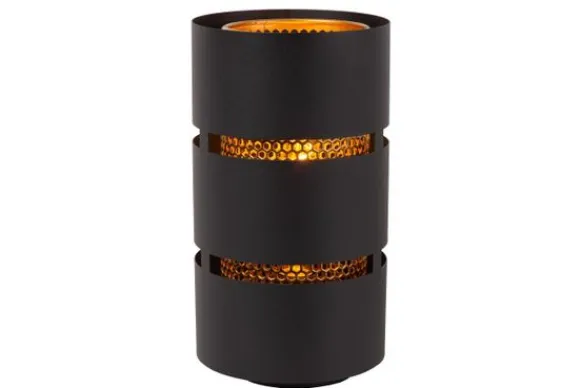 Tafellamp Rosas van het merk Lucide is een compacte designlamp met een groots effect. Het cilindervormige metalen lichaam straalt kracht en elegantie uit, terwijl de goudkleurige honingraatstructuur aan de binnenzijde zorgt voor een warme gloed die subtiel door de openingen heen speelt.