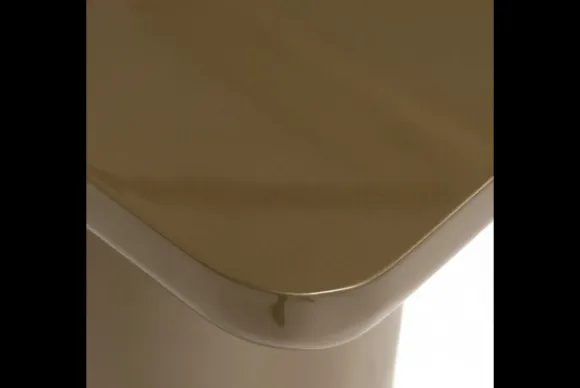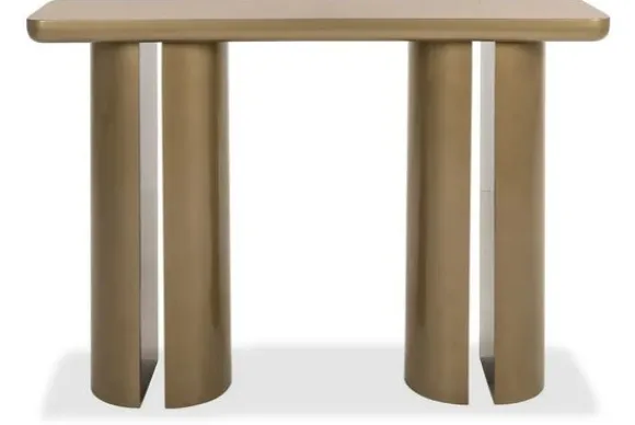 De afgeronde vormen van het blad vloeien harmonieus samen met de sculpturale, halfronde poten. De warme goudtint en het strakke lijnenspel zorgen voor een moderne elegantie die perfect past in een hotel chic interieur.