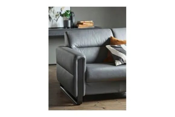 De bank wordt standaard uitgevoerd met mat zwarte details op de armleuningen, er kan ook voor chroom gekozen worden.