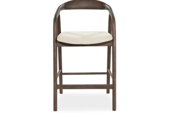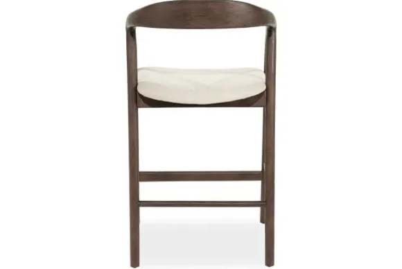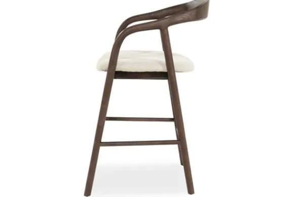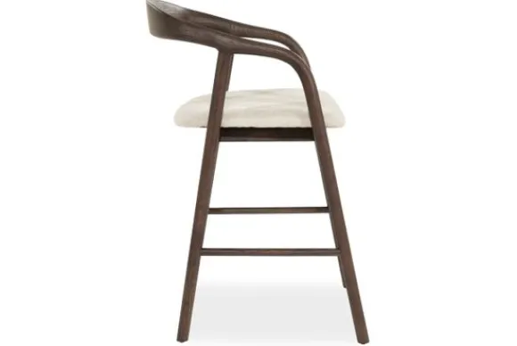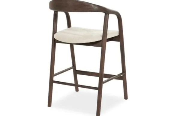 De zitting is bekleed met een zachte, lichtgekleurde stof die een prachtig contrast vormt met het donkere hout. Dit spel tussen licht en schaduw geeft de barkruk een gelaagde visuele diepte, alsof hij zich moeiteloos aanpast aan elk interieur waar hij in staat.