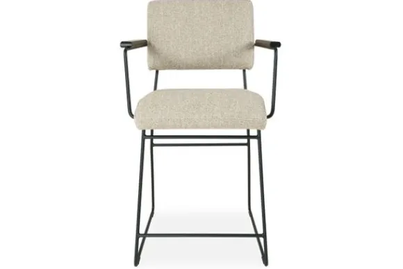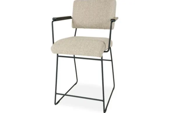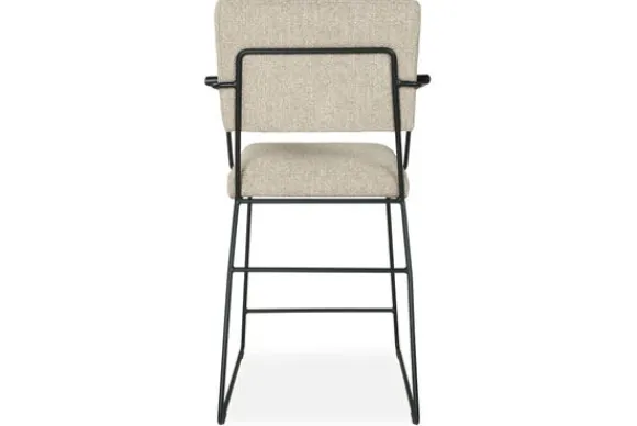 Het smalle frame en de open ruimte tussen zitting en rugleuning geven de barkruk een luchtige uitstraling. De poten zijn uitgevoerd in zwart gepoedercoat metaal voor een strakke afwerking.