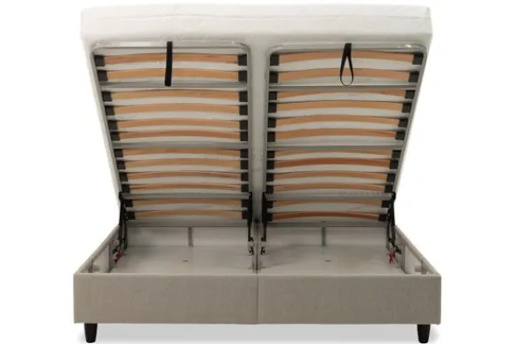 Fortuna is voorzien van een box met lattenbodem en slimme opbergruimte, waardoor je niet alleen geniet van optimale ondersteuning en ventilatie tijdens het slapen, maar ook extra ruimte creëert om dekens, kussens of andere spullen stijlvol en praktisch op te bergen.