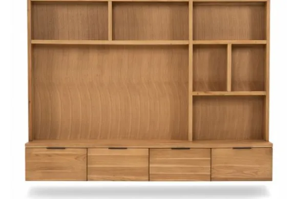 De hangkast beschikt over zes open vakken voor het presenteren van woonaccessoires en decoratie. Daarnaast zijn er vier lades aanwezig die zijn uitgevoerd met een softclose systeem. Deze indeling zorgt voor een prettig evenwicht tussen open en gesloten opbergruimte.