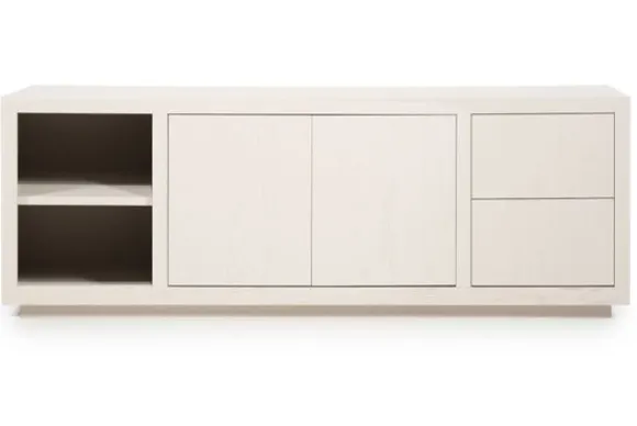 Het dressoir heeft twee deuren, twee lades en twee open vakken. Deze indeling biedt praktische opbergruimte voor servies, accessoires of papieren. De open vakken geven het meubel een open en functioneel uiterlijk. Het dressoir maakt deel uit van de Helsinki met bijpassende meubels.