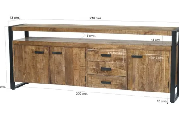 Het dressoir is gemaakt van mangohout in combinatie met zwart gecoat staal. Mangohout is een sterke en duurzame houtsoort met een zichtbare nerf en natuurlijke variatie. Het stalen frame zorgt voor een stabiele en stevige constructie.