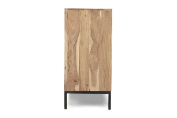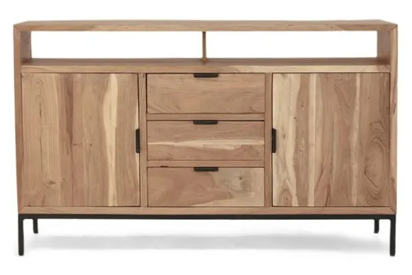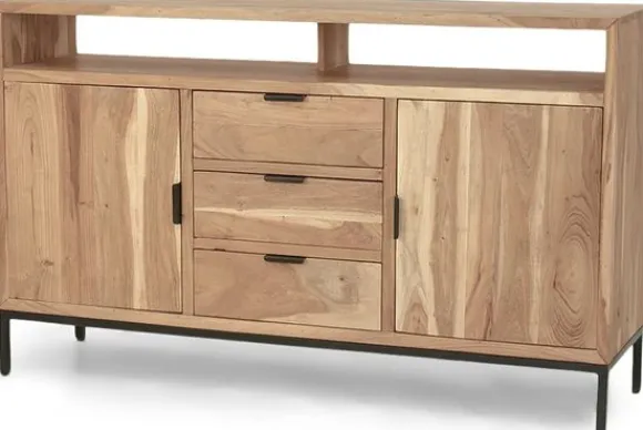 Dressoir Oslo van het merk Livingfurn is gemaakt van acaciahout in combinatie met gecoat staal. Deze combinatie zorgt voor het stoere uiterlijk van deze kast. Acaciahout is een duurzaam natuurproduct, elk stuk is hierdoor uniek. Na verloop van tijd krijgt deze houtsoort een warmere kleur. Je kunt dit hout makkelijk schoonmaken met een zachte vochtige doek. Deze kast heeft diverse opbergmogelijkheden, namelijk één groot open vak, drie lades en twee deuren.