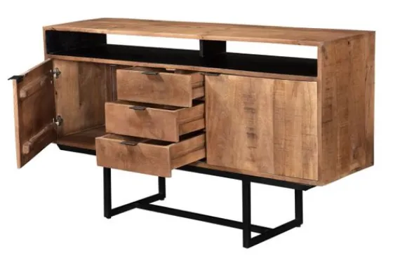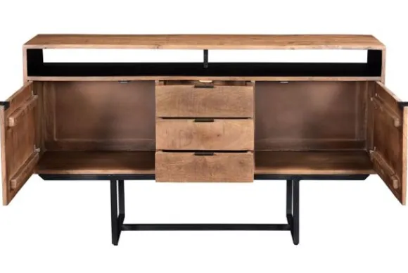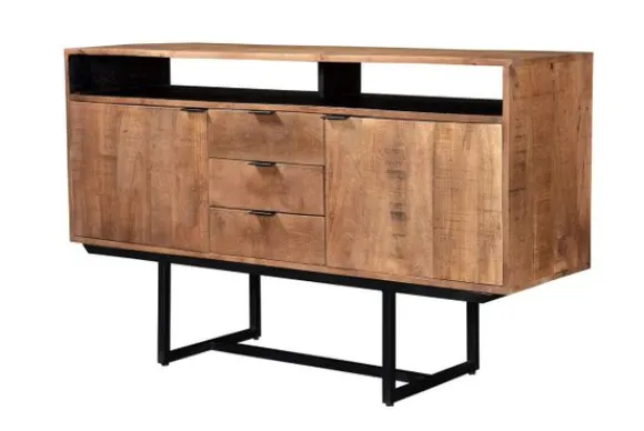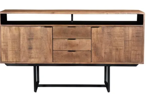 Dressoir Valdez van het merk Livingfurn is gemaakt van mangohout in combinatie gecoat staal. Mangohout is een duurzame houtsoort, heeft een fijne nerf en is uniek, omdat elk stuk er net iets anders uitziet. De kast staat op hoge poten van zwartkleurig gecoat staal. Deze kast heeft drie deuren, waardoor er genoeg opbergruimte is.