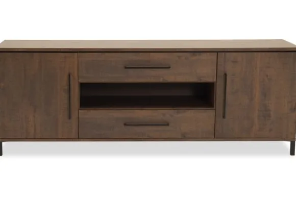 Het dressoir beschikt over twee deuren, twee lades en één open vak. Deze indeling combineert gesloten opbergruimte met plek voor decoratie of boeken. Het open vak kan optioneel worden voorzien van LED verlichting voor extra sfeer.