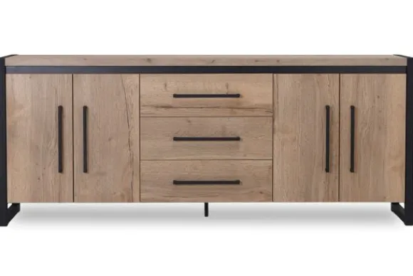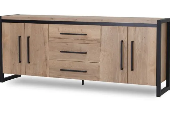 Het dressoir is voorzien van vier deuren en drie lades in het midden. Deze indeling biedt ruime opbergmogelijkheden voor servies, documenten of andere spullen die je netjes uit het zicht wilt opbergen.