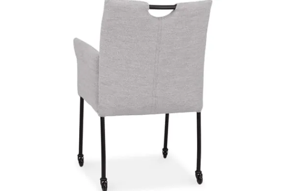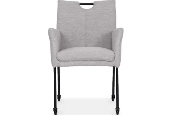 Eetkamerstoel Dinand van het merk Donc is een eetkamerstoel met armleuningen en een comfortabele zitting. Het horizontale stiksel in de rug geeft de stoel een herkenbaar detail. De zwart metalen poten zorgen voor een stevige basis. Dankzij de wieltjes en het handvat verplaats je de stoel eenvoudig aan de eettafel.