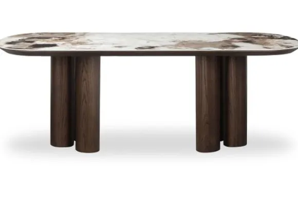 Eettafel Langford 214222 van het merk Richmond Interiors is een opvallend meubelstuk dat direct de aandacht trekt. Het ovale tafelblad is afgewerkt met een keramische toplaag waarin lichte en donkere tinten op speelse wijze samenkomen.