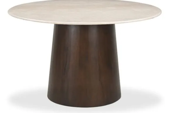 Eettafel Bottecino van het merk Livingfurn heeft een rond blad van marmer en een stevige poot van mangohout. Het marmer geeft iedere tafel een eigen uitstraling door de natuurlijke aders en kleurnuances. Het lichte blad en het donkere hout vormen samen een luxe en warme combinatie.