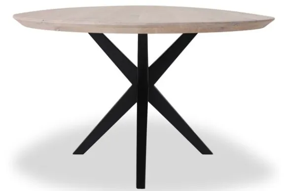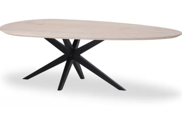 Bij de maten van 180 cm tot en met 240 cm met een diepte van 110 cm is het blad 4 cm dik, waarvan 2 cm opgedikt voor een robuuste en luxe uitstraling. De maat 240 cm met een diepte van 120 cm en de maat 260 cm hebben een volledig massief blad van 4 cm dik. De metalen spinpoot heeft een speels, stervormig ontwerp dat zorgt voor een luchtige basis en een eigentijds accent.