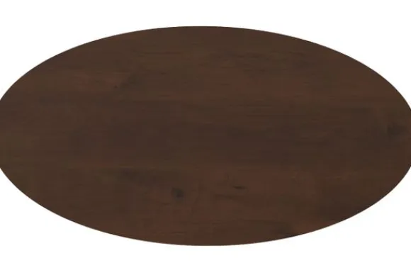 Eettafel Giro van het merk De Houtmaatschappij met zijn ovale tafelblad van hout straalt warmte en ambacht uit, terwijl de donkere tint een gevoel van diepte en elegantie toevoegt aan de ruimte. Het houten blad van de Giro eettafel heeft een natuurlijke nerftekening die elk exemplaar uniek maakt.