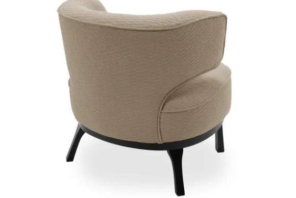 De subtiele bies benadrukt de elegante ronde vormen van de fauteuil en zorgt voor een verfijnd accent. Het zwarte houten onderstel biedt stabiliteit en vormt een stijlvol contrast met de bekleding.