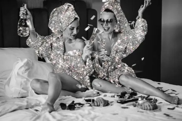 Glasschilderij vrouwen op bed 080120-871 van het merk Ter Halle is 120 cm breed en 80 cm hoog. Op dit schilderij zie je twee vrouwen in glitter outfit die genieten van een fles champagne. Een glasschilderij heeft levendige kleuren, een glanzende afwerking en een realistisch diepte-effect. Al deze eigenschappen zorgen voor de luxe uitstraling van dit schilderij.