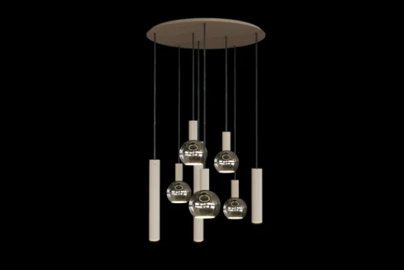 De lamp is uitgerust met vijf E27-fittingen en drie GU10-fittingen (50 mm). Dankzij deze mix van lichtpunten heb je volop mogelijkheden om sfeer en lichtintensiteit naar wens aan te passen.