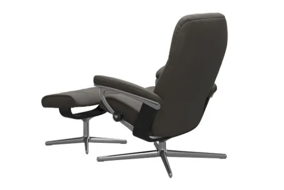 Relaxfauteuil Consul Cross van het merk Stressless is verkrijgbaar in alle kleuren. Tevens is de fauteuil leverbaar in stof en rundleder. Je kunt bij deze fauteuil kiezen uit diverse maten zoals Small, Medium en Large. Deze fauteuil heeft een Plus en Glide Systeem: Aan beide zijden van de fauteuil zit een knop waarmee je de weerstand van de stoel kan aanpassen naar eigen behoefte. Door de knoppen in tegengestelde richting te draaien stel je jouw ideale relaxpositie samen. Op die manier krijgt de nek en de onderrug goede onderstuening. Door de rugleuning naar voren te buigen activeer je de slaapfunctie. Op het moment dan je weer rechtop komt stelt de stoel zichzelf weer bij naar de normale stand.