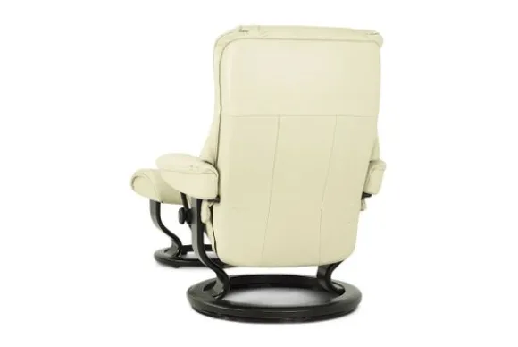 Relaxfauteuil Mayfair Classic van het merk Stressless is verkrijgbaar in alle kleuren. Tevens is de fauteuil leverbaar in stof en rundleder. Je kunt bij deze fauteuil kiezen uit diverse maten zoals Small, Medium en Large. Deze fauteuil heeft een Plus en Glide Systeem: Aan beide zijden van de fauteuil zit een knop waarmee je de weerstand van de stoel kan aanpassen naar eigen behoefte. Door de knoppen in tegengestelde richting te draaien stel je jouw ideale relaxpositie samen. Op die manier krijgt de nek en de onderrug goede onderstuening. Door de rugleuning naar voren te buigen activeer je de slaapfunctie. Op het moment dan je weer rechtop komt stelt de stoel zichzelf weer bij naar de normale stand.