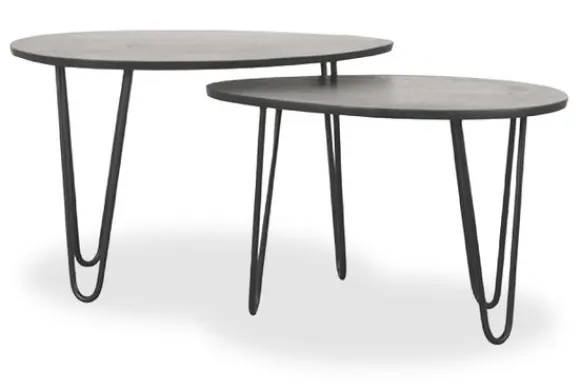 Frisk bestaat uit twee organisch gevormde ovale tafels. Onder de grote ronde tafel van 63x43x44 cm schuif je makkelijk de kleinere tafel van 60x42x40 cm. Zo bepaal je helemaal zelf hoe je de tafels neerzet. De tafelbladen zijn uitgevoerd in de kleur rough, voorzien van de mooiste natuurlijke kleurnuances en de fraaiste nerven. Het rondvormige grof afgewerkte metalen frame in de kleur zwart geeft de tafels een stoer, krachtig en industrieel karakter met een ludiek effect.