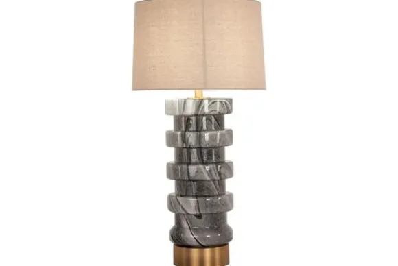 Tafellamp Jaylee 213389 van het merk Richmond Interiors is een uitgesproken designstuk dat meteen de aandacht trekt. De sculpturale voet heeft een gelaagd patroon in diepe aardetinten met marmerachtige lijnen. De ronde, lichtbeige kap zorgt voor een warme, diffuse gloed en vormt een harmonieus contrast met de donkere basis. De goudkleurige voet onderaan geeft het geheel een luxe uitstraling en een stijlvol tintje.
