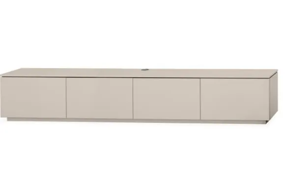 Het tv-meubel is voorzien van greeploze klepdeuren met daarachter ruime opbergvakken voor apparatuur, kabels en accessoires. Het geïntegreerde kabelmanagement zorgt voor een opgeruimd geheel. Dit model kan zonder plint worden besteld, waardoor het meubel aan de wand kan worden gemonteerd en een extra ruimtelijk effect creëert.