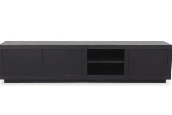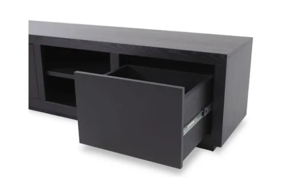 Het tv-meubel heeft twee open vakken, twee deuren en één lade. Deze indeling biedt ruimte voor apparatuur en zorgt voor extra opbergruimte uit het zicht. Het tv-meubel maakt deel uit van een met bijpassende meubels.