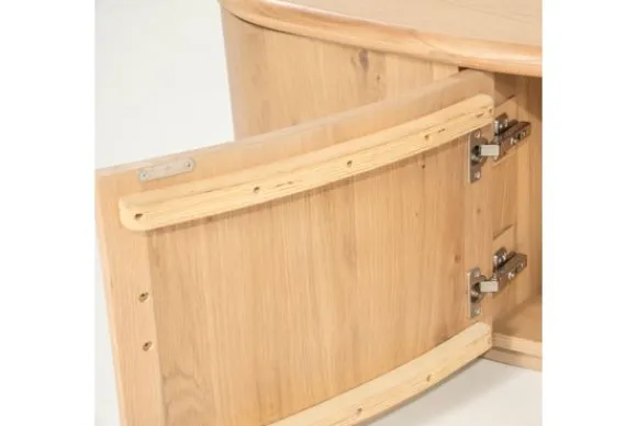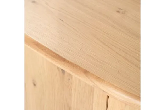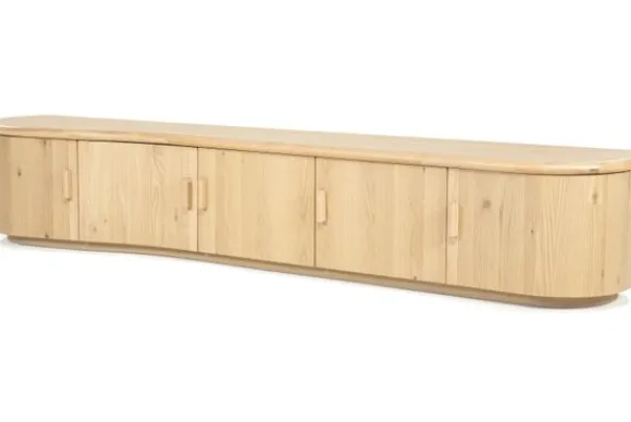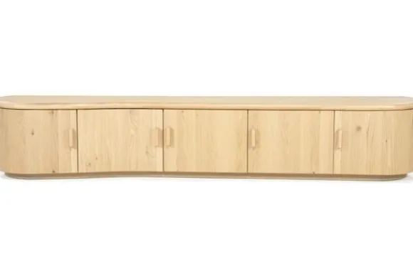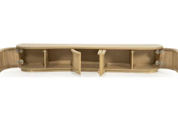 Het lichte golvende ontwerp van het front en het bovenblad zorgt voor een rustig en natuurlijk effect. De afgeronde hoeken maken het geheel nog zachter en geven het meubel een prettige uitstraling. Door deze vormgeving voelt het tv-meubel toegankelijk en makkelijk te combineren in verschillende woonruimtes.