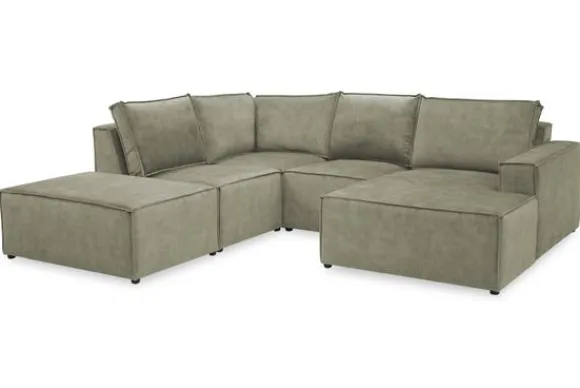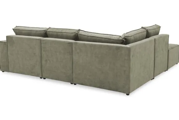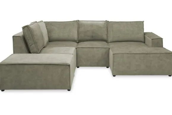 Dit bankstel is zelf samen te stellen in vele afmetingen en elementen, of je kunt gaan voor een van de standaard opstellingen. Deze opstelling is uitgerust met een speelse poef.