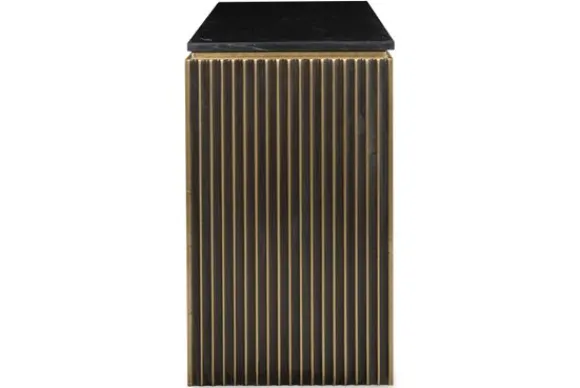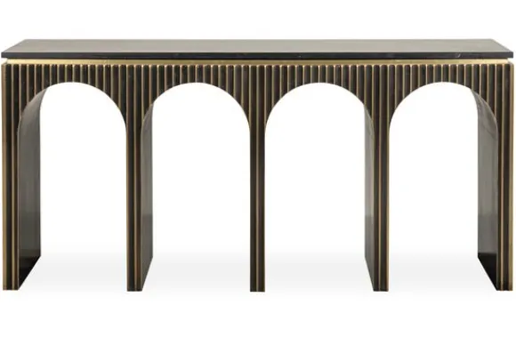 Wandtafel Les Arcs 212980 van het merk Richmond Interiors is gemaakt van brass (staal in mat goud) in combinatie met hout en marmer. Brass is een legering van koper en zink, dat vervolgens wordt afgewerkt met een geborsteld effect. Dit zorgt voor een matte afwerking. Brass is eenvoudig schoon te maken met een lichtvochtige doek, het nadrogen van het oppervlak zorgt voor een streeploos resultaat. Marmer is een duurzame steensoort en heeft een luxe en stijlvolle uitstraling. De steensoort is een natuurproduct en kenmerkt zich door de unieke afwerkingen en kan zowel grove als gladde delen bevatten. Door de kenmerkende kleurschakeringen en aders is geen product hetzelfde. Zo haal je met een marmer product dus echt iets unieks in huis. De wandtafel heeft een unieke uitstraling door de vier bogen, hierdoor oogt het wandtafel ruimtelijk.