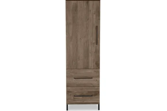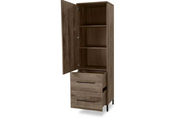 De Napoli wandkast is bovenin voorzien van één gesloten deur met daarachter drie vakken. In het onderste gedeelte bevinden zich twee lades. De deuren en lades zijn afgewerkt met smalle zwart metalen handgrepen en uitgerust met softclose dempers en ladegeleiders voor een stille en soepele sluiting.