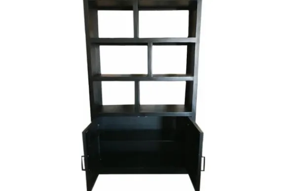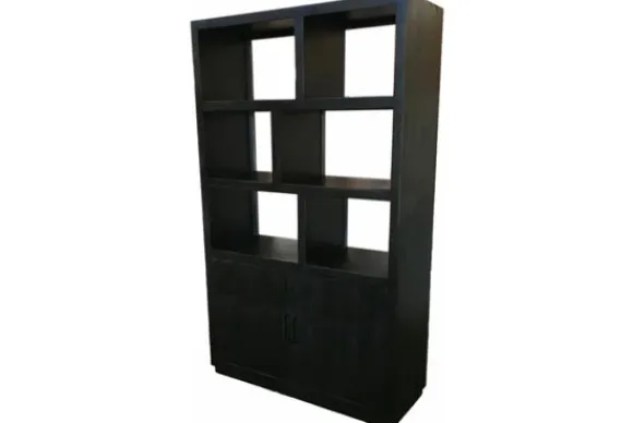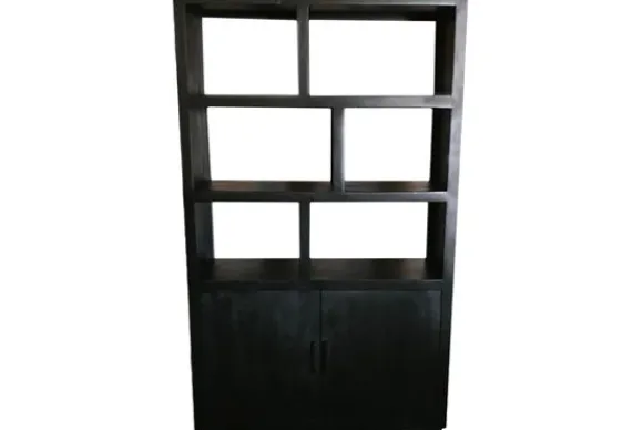 De kast is voorzien van open vakken in verschillende afmetingen, wat zorgt voor een speels geheel en ruimte voor decoratie. Aan de onderzijde bevinden zich twee deuren voor extra opbergruimte.