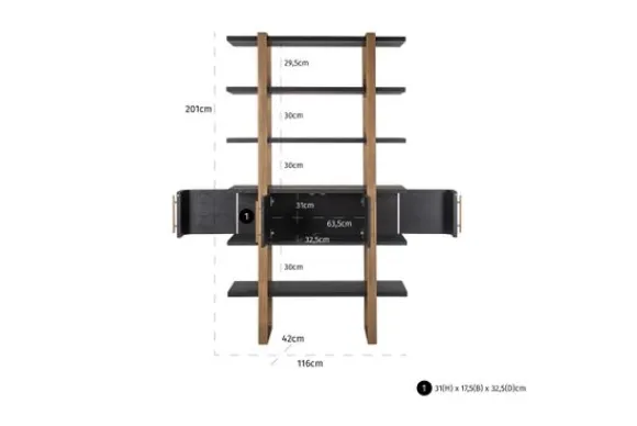 Alle planken hebben een afmeting van B116 x D42 x H30 cm, behalve de één na bovenste plank.