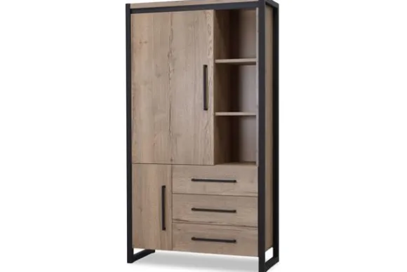 De wandkast is voorzien van drie open vakken, drie lades en twee deuren. Deze indeling biedt een prettige balans tussen open presentatie en gesloten opbergruimte. Ideaal voor het uitstallen van accessoires en het netjes opbergen van spullen.