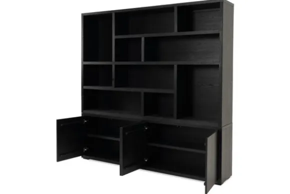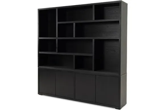 Bergkast Velori van het merk Castiq straalt rust en karakter uit met zijn ontwerp in zwart eikenhout. De houtstructuur geeft de kast een natuurlijke diepte. De asymmetrische indeling zorgt voor een speels effect, waardoor de kast een echte blikvanger wordt in de ruimte.