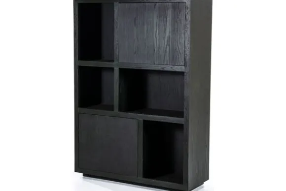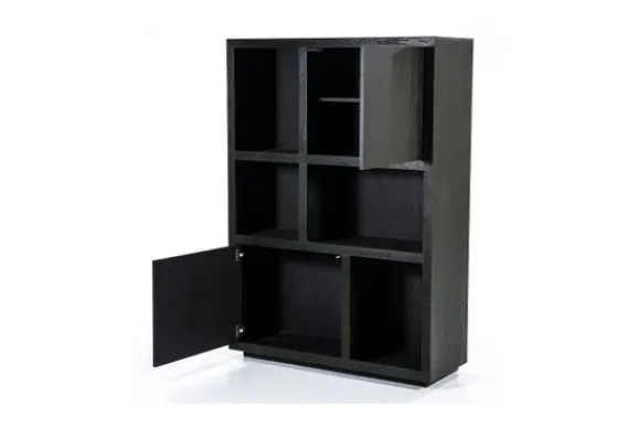 Het kabinet heeft open vakken in diverse formaten en is voorzien van twee deuren. Deze indeling biedt ruimte voor servies, woonaccessoires of boeken. De combinatie van open en gesloten vakken zorgt voor een overzichtelijke en praktische opstelling. Het kabinet maakt deel uit van een met bijpassende meubels.
