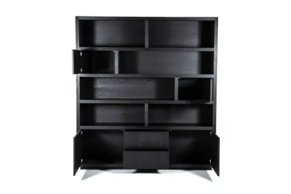 Het kabinet heeft open vakken in diverse formaten en is voorzien van vier deuren en twee lades. Deze indeling biedt veel ruimte voor servies accessoires of andere spullen. Het kabinet maakt deel uit van een met bijpassende meubels.