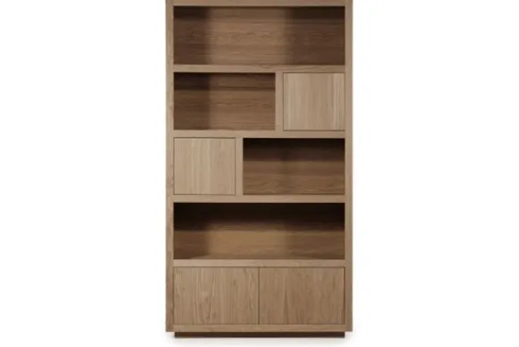 Het kabinet heeft open vakken in diverse formaten en is voorzien van vier deuren. Deze indeling biedt veel opbergruimte voor servies, woonaccessoires of boeken. De combinatie van open en gesloten vakken zorgt voor overzicht en praktisch gebruik. Het kabinet maakt deel uit van een met bijpassende meubels.